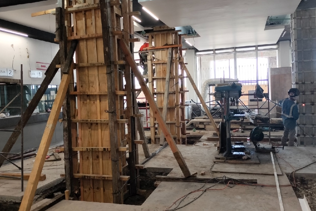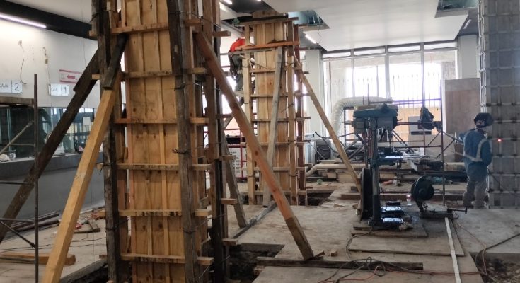 De acuerdo con los trabajos que se realizan, bajo la supervisión de la dirección general de Obras Públicas Municipales se realiza el reforzamiento de columnas en el área del acceso principal del edificio y del vestíbulo; con perforaciones para el anclaje y colocación de acero de refuerzo, para posteriormente colocar concreto hidráulico.